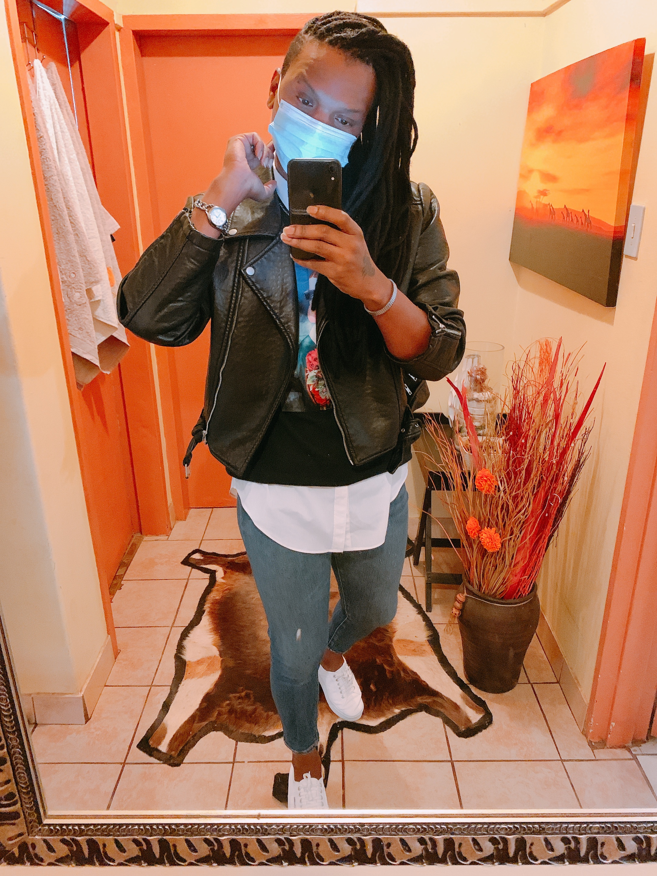 The jackets compliments the denim jeans and decided to spice it up with a super loose t-shirt and gold accessories not forgetting the comfy #converse.